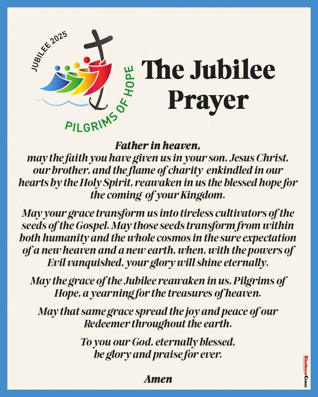 As we continue to celebrate the Jubilee Year 2025, ending on January 6, 2026, we encourage all parishioners to take up the Jubilee Prayer as part of their daily prayer life. This simple act helps us unite with the universal Church in seeking renewal, mercy, and grace during this extraordinary year. Let us journey together in faith and make the most of this time of grace by turning to God each day in prayer.